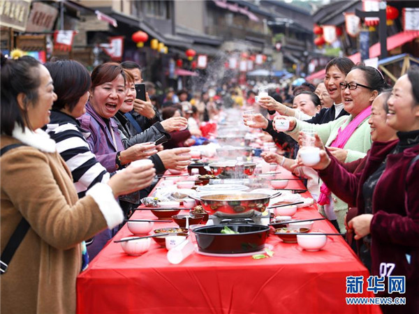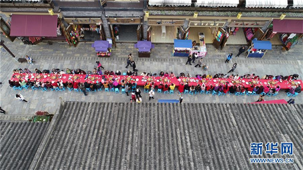 10月18日,游客在貴州省丹寨縣萬達小鎮(zhèn)吃新節(jié)長桌宴上品嘗佳肴。當日,貴州省黔東南苗族侗族自治州丹寨縣萬達小鎮(zhèn)舉辦苗族吃新節(jié)體驗活動。當地苗族同胞跳蘆笙舞、品長桌宴,并邀請游客參與其中,大家在歡聲笑語中樂享金秋。新華社發(fā)(陸德華攝)