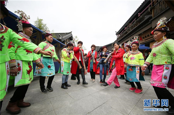 10月18日,游客在貴州省丹寨縣萬達小鎮(zhèn)吃新節(jié)上體驗苗族傳統(tǒng)蘆笙舞。當日,貴州省黔東南苗族侗族自治州丹寨縣萬達小鎮(zhèn)舉辦苗族吃新節(jié)體驗活動。當地苗族同胞跳蘆笙舞、品長桌宴,并邀請游客參與其中,大家在歡聲笑語中樂享金秋。新華社發(fā)(黃曉海攝)