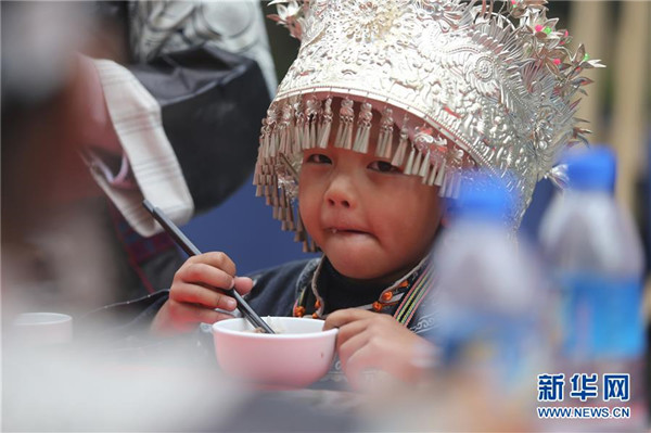 10月18日,一名小朋友在貴州省丹寨縣萬達小鎮(zhèn)吃新節(jié)長桌宴上品嘗佳肴。當日,貴州省黔東南苗族侗族自治州丹寨縣萬達小鎮(zhèn)舉辦苗族吃新節(jié)體驗活動。當地苗族同胞跳蘆笙舞、品長桌宴,并邀請游客參與其中,大家在歡聲笑語中樂享金秋。新華社發(fā)(張暉攝)
