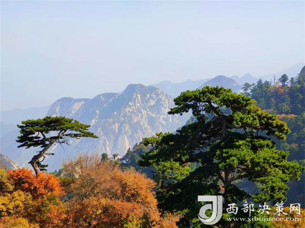 秋天的華山很是動人。天高云淡,漫山紅葉分外妖嬈,彩林賞心悅目,一步一景,滿目所見皆是驚喜。若是乘索道而上,層林金黃與郁郁蔥蔥的華山松、灰白的花崗巖山體相互迎映襯,形成了秋天多彩的西岳風光。