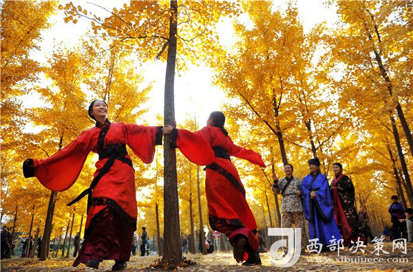 華服體驗(yàn)者身著漢服盡享銀杏林浪漫醉人的美景