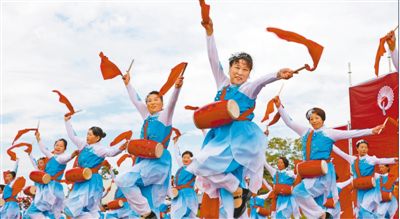 山東榮成市民文化活動公園,1000多名當?shù)厝罕娗闷鹧?,共同抒發(fā)走向全面小康生活的幸福與美好。 |