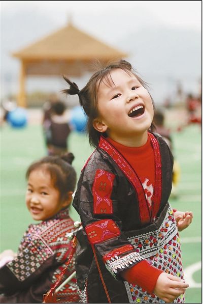 貴州省黔東南苗族侗族自治州劍河縣幸福社區(qū)中心幼兒園,易地扶貧搬遷戶的子女們身著民族服裝,樂享趣味游戲。 |