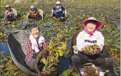 安徽省宣城市宣州區(qū)朱橋鄉(xiāng)渾水村,村民們正在采收菱角。這里是典型的水鄉(xiāng),產(chǎn)出的菱角品質(zhì)極佳。通過種植菱角,每位村民可增收4000多元。 |