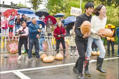湖北省蘄春縣檀林鎮(zhèn)霧云山村村民們和游客參加運南瓜趣味比賽,歡慶豐收。 |