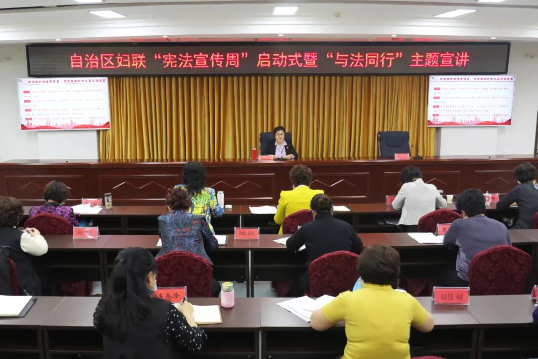 今年12月4日是第七個國家憲法日,也是我國第三個“憲法宣傳周”。今年的活動主題為“深入學習宣傳習近平法治思想,大力弘揚憲法精神”。為全面貫徹落實黨的十九屆五中全會精神和第三次中央新疆工作座談會精神,充分發(fā)揮婦聯(lián)組織的優(yōu)勢和作用,推動憲法學習宣傳走入日常生活、走入干部群眾,11月30日, 自治區(qū)婦聯(lián)按照自治區(qū)黨委全面依法治疆委員會辦公室要求,舉辦了“憲法宣傳周”啟動式暨“與法同行”主題宣講活動。