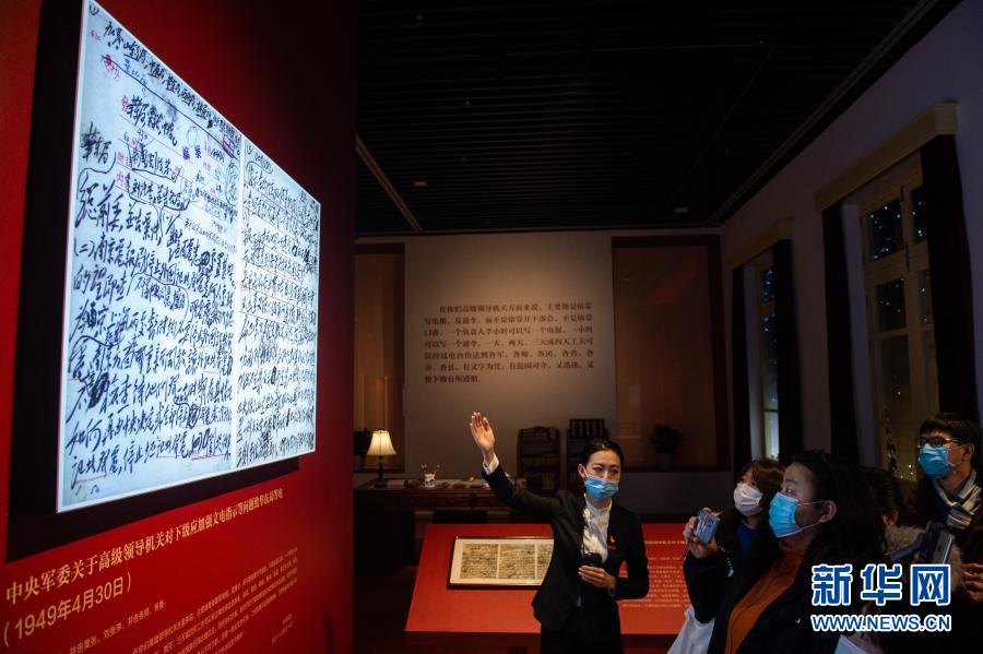 “毛澤東同志香山時期發(fā)布電報手稿專題展覽”在北京香山革命紀(jì)念館開展,講解員(左一)向媒體記者介紹電報內(nèi)容(2020年12月16日攝)。新華社記者 陳鐘昊 攝