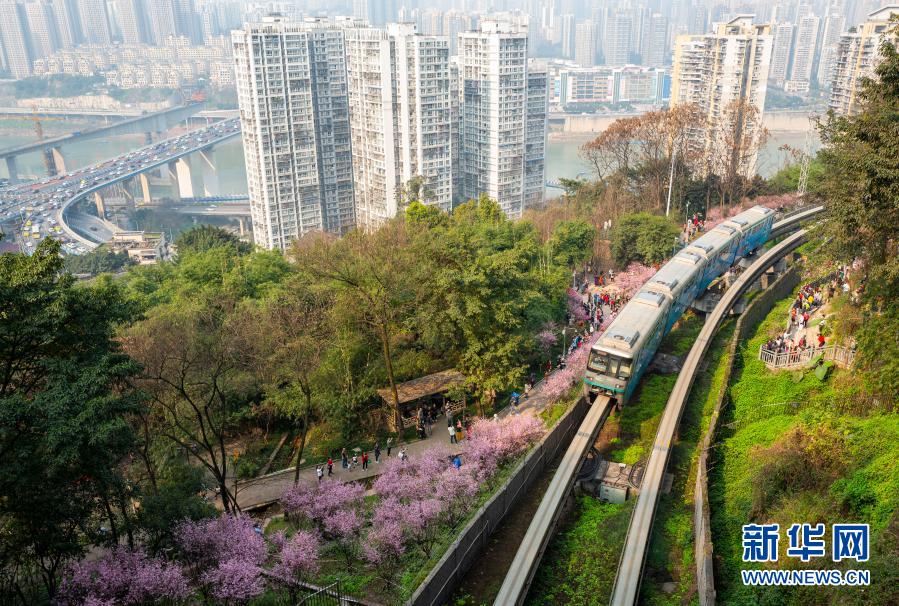 2月23日,在重慶軌道交通2號線佛圖關(guān)段,游客在山城步道上拍攝穿越花海的單軌列車。新華社記者 劉潺 攝