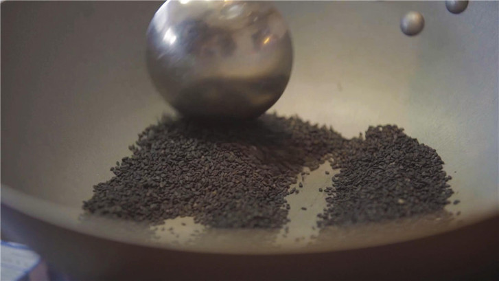 將炒熟的黑芝麻加入白砂糖放入研磨機(jī)。