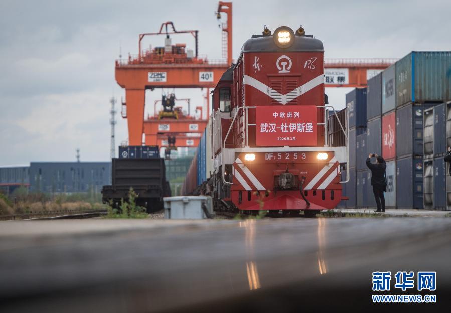 開(kāi)往德國(guó)杜伊斯堡的中歐(武漢)班列從中鐵聯(lián)集武漢中心站駛出(2020年3月28日攝)。這是自疫情防控以來(lái),從武漢開(kāi)出的首趟中歐班列,標(biāo)志著中歐班列(武漢)恢復(fù)常態(tài)化運(yùn)營(yíng)。新華社記者 肖藝九 攝