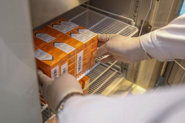 醫(yī)護(hù)人員從移動疫苗接種車上的冷藏箱內(nèi)取出新冠疫苗。新華社記者張玉薇 攝