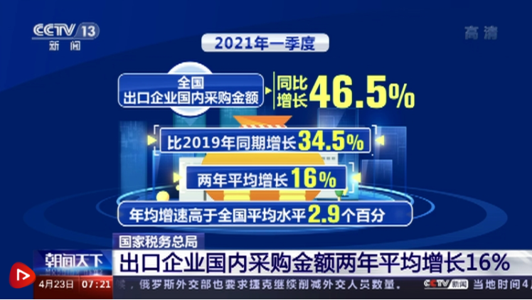2021年一季度,海外需求復蘇繼續(xù)拉動我國出口快速增長,全國出口企業(yè)國內(nèi)采購金額同比增長46.5%,比2019年同期增長34.5%,兩年平均增長16%,年均增速高于全國平均水平2.9個百分點。