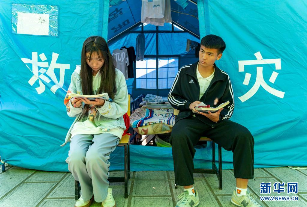 5月24日,漾濞一中兩名高三年級學(xué)生在帳篷前聽課。新華社記者陳欣波攝