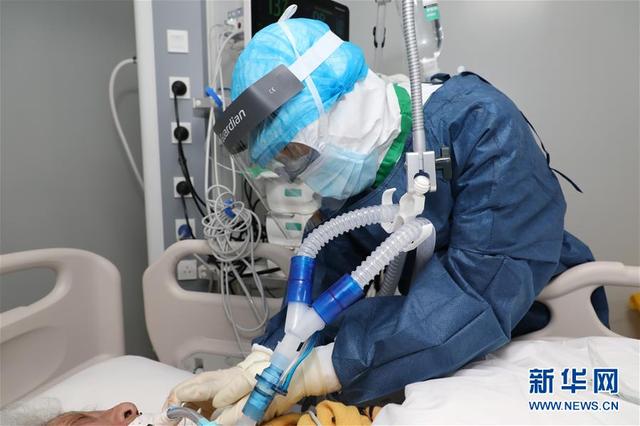 海軍軍醫(yī)大學(xué)第二附屬醫(yī)院急診、重癥醫(yī)學(xué)科護士長陳靜在武漢火神山醫(yī)院為患者進行氣管插管后的導(dǎo)管固定(2月19日攝)。新華社發(fā)(陳晨 攝)