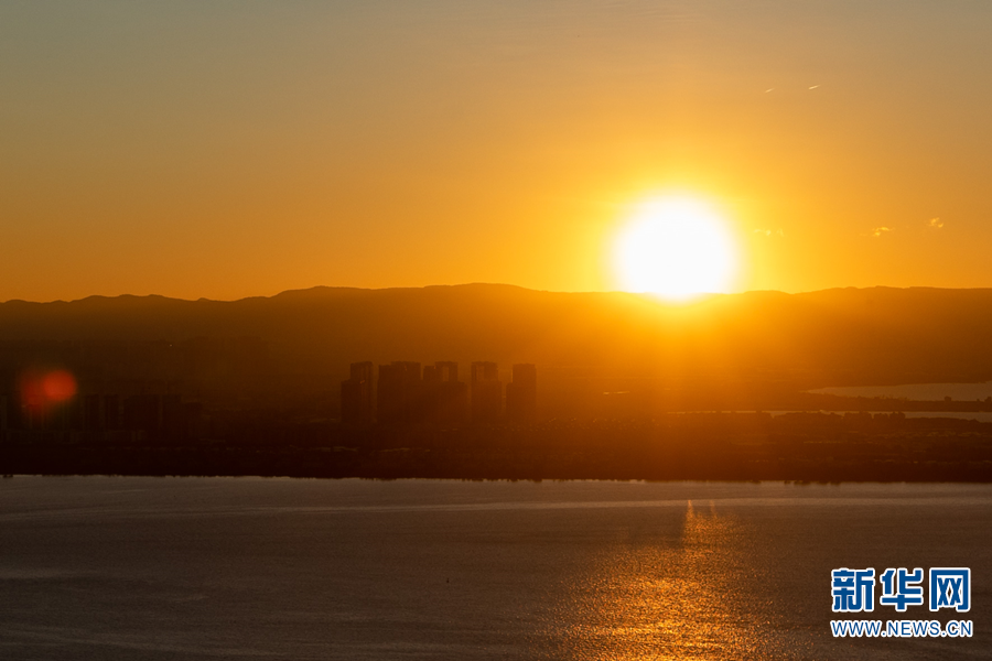 絢爛的霞光染紅了天空和滇池水面(11月20日攝)。新華網(wǎng) 劉東 攝