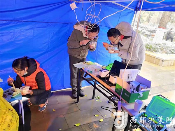 正當(dāng)隊(duì)員們準(zhǔn)備修整一天時(shí),新的命令到了,要求醫(yī)療隊(duì)安排300名隊(duì)員支援雁塔區(qū)核酸采集工作,大家毫無怨言,坐上了趕赴雁塔區(qū)的大巴。這是最不尋常的一天,醫(yī)療隊(duì)承擔(dān)了雁塔區(qū)近10個(gè)居民區(qū)的核酸采樣任務(wù),且大部分都屬于封控區(qū)。核算采樣需上門采集,風(fēng)險(xiǎn)大、難度高,因?yàn)樾畔⒉杉O(shè)備無法上樓,只能依靠人工信息錄入,隊(duì)員們身穿防護(hù)服,在操作極其困難的情況下做到了不漏一戶,不落一人。采集結(jié)束已是25日凌晨1點(diǎn),來自漢臺(tái)區(qū)的余晗和趙凌最后的采集任務(wù)已是凌晨2點(diǎn),此時(shí)的千年古都正飄落著冬日的雪花。這次入戶采集共完成49081人次。