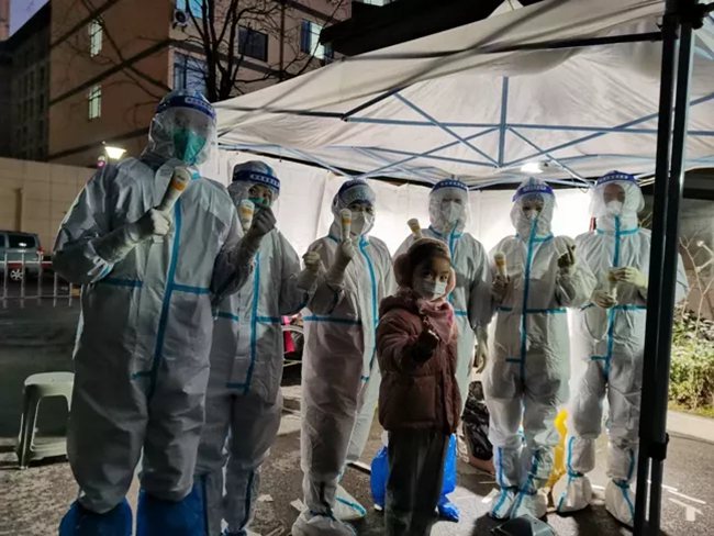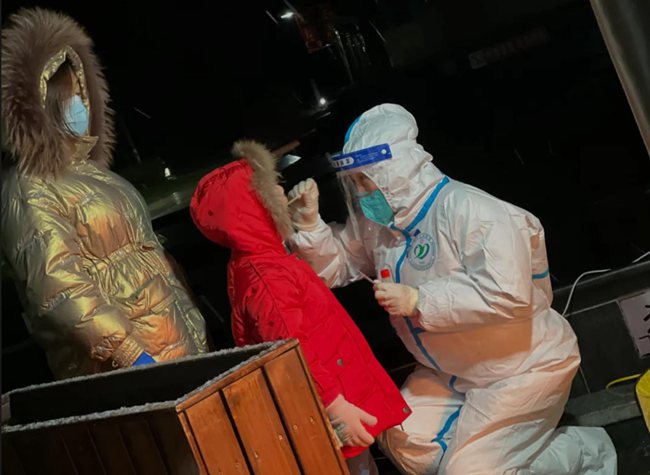 “姐姐,你冷不冷,你手疼不疼?”在排隊(duì)的隊(duì)伍中,一個(gè)小姑娘帶著哭腔問身著防護(hù)服的王航英。原來,王航英已經(jīng)連續(xù)采集核酸近十個(gè)小時(shí),換班時(shí)她脫下手套,想抽一張紙,結(jié)果雙手被凍得通紅,反復(fù)幾次都沒成功。