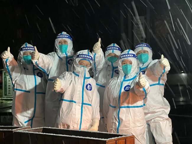 西安大興醫(yī)院的醫(yī)護(hù)人員在風(fēng)雪中加油打氣。西安大興醫(yī)院供圖