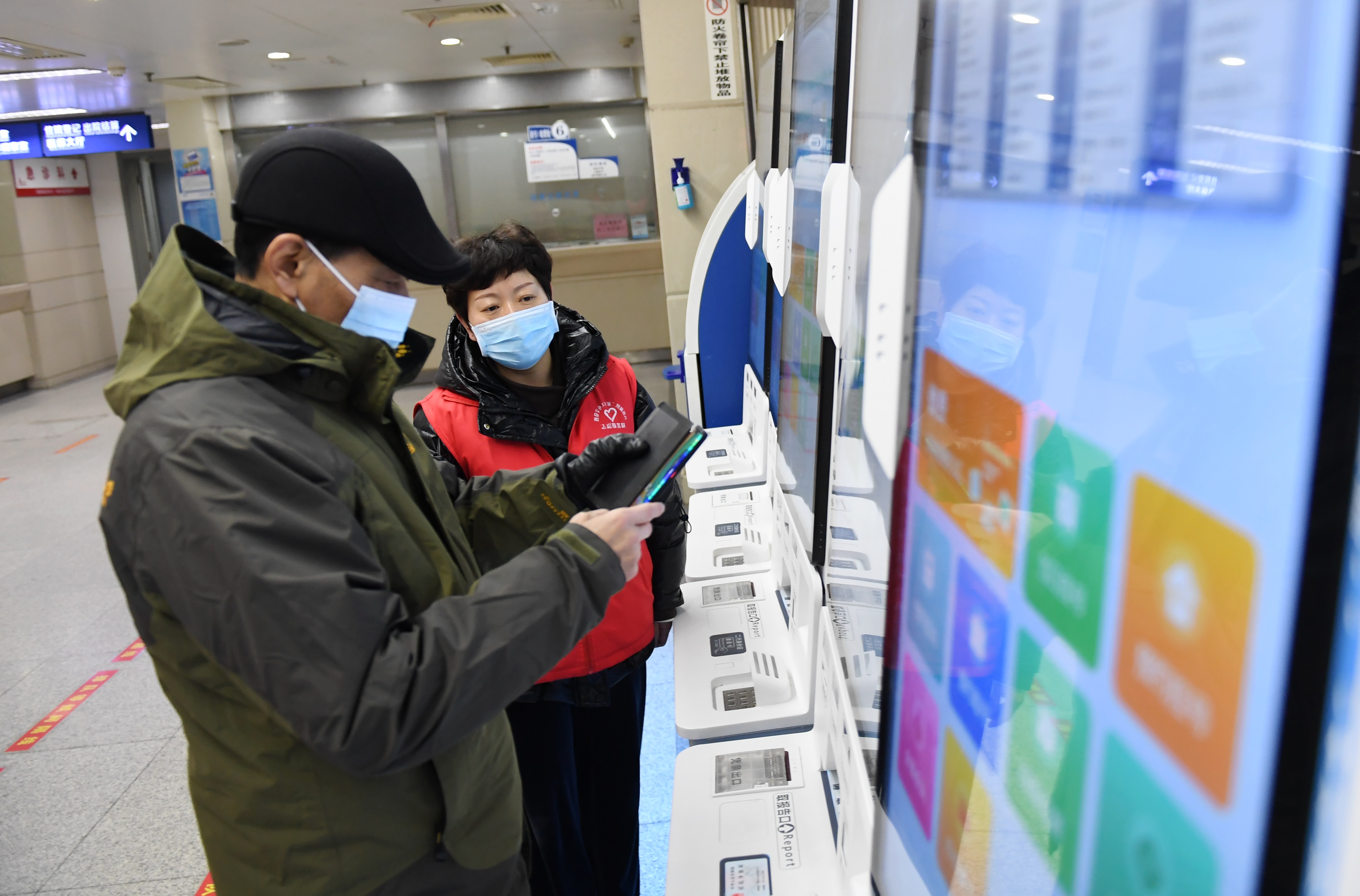 1月8日,在西安交通大學(xué)第二附屬醫(yī)院,志愿者協(xié)助就診患者支付掛號費。新華社記者 李一博 攝