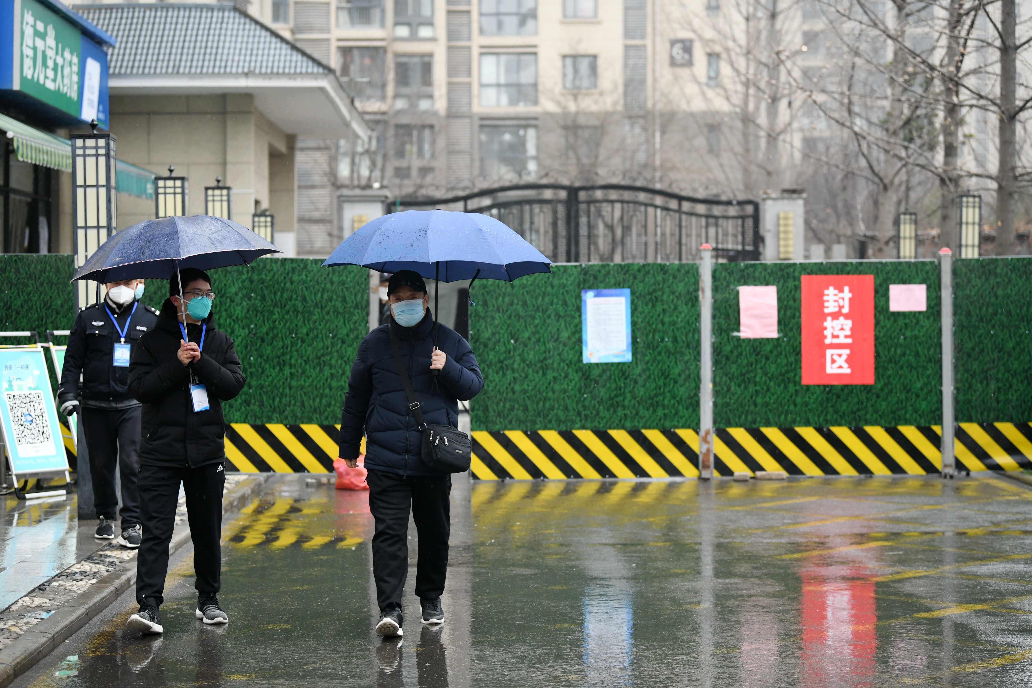 1月8日,在西安市蓮湖區(qū)上和城小區(qū),工作人員陪同患病居民(右)外出就醫(yī)。新華社記者 李一博 攝