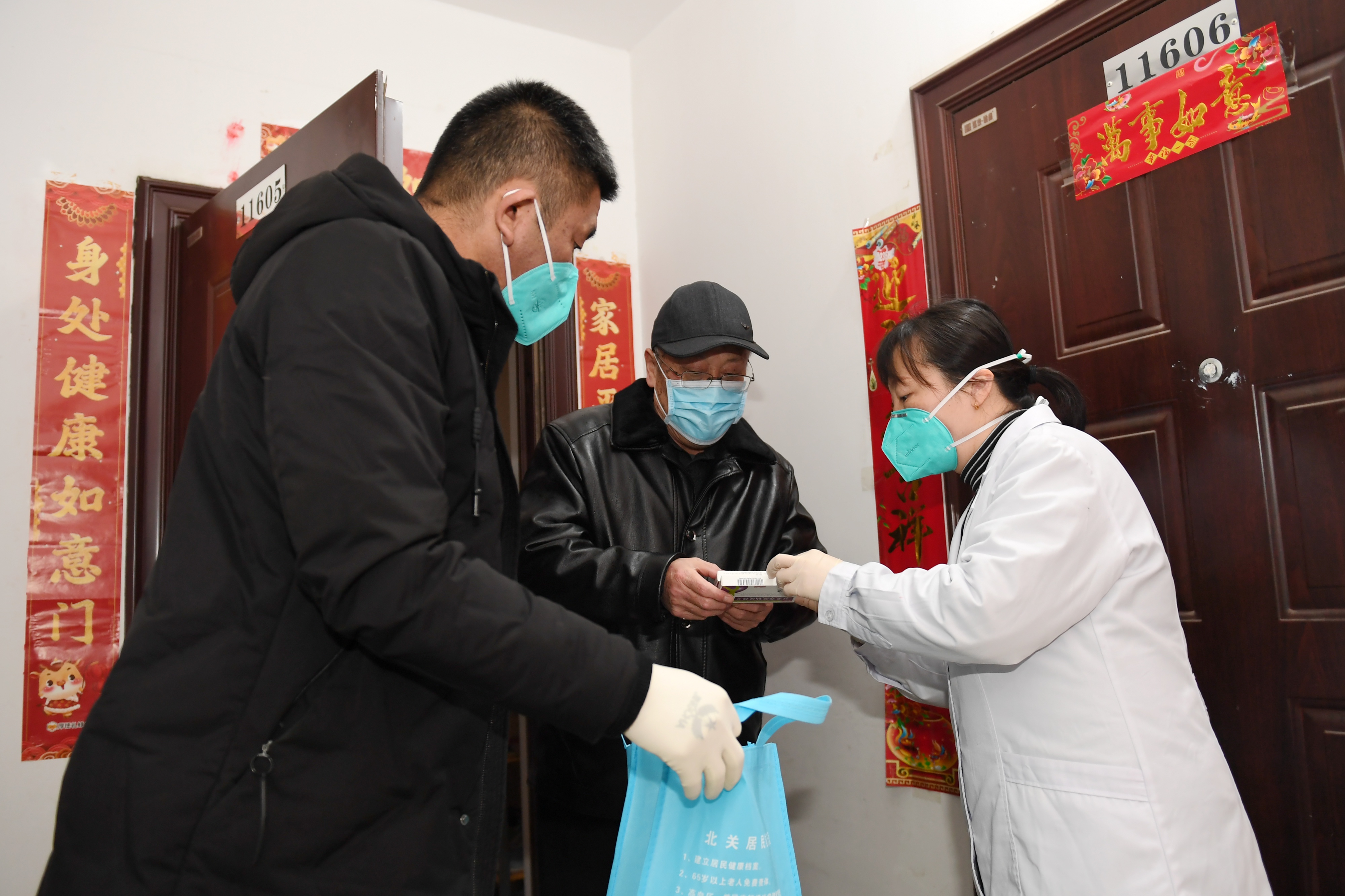 1月8日,在西安秦地雅仕小區(qū),蓮湖區(qū)北關(guān)社區(qū)衛(wèi)生服務(wù)中心檢驗師韓涼(右)為電話就醫(yī)的患者送藥上門。新華社記者 李一博 攝