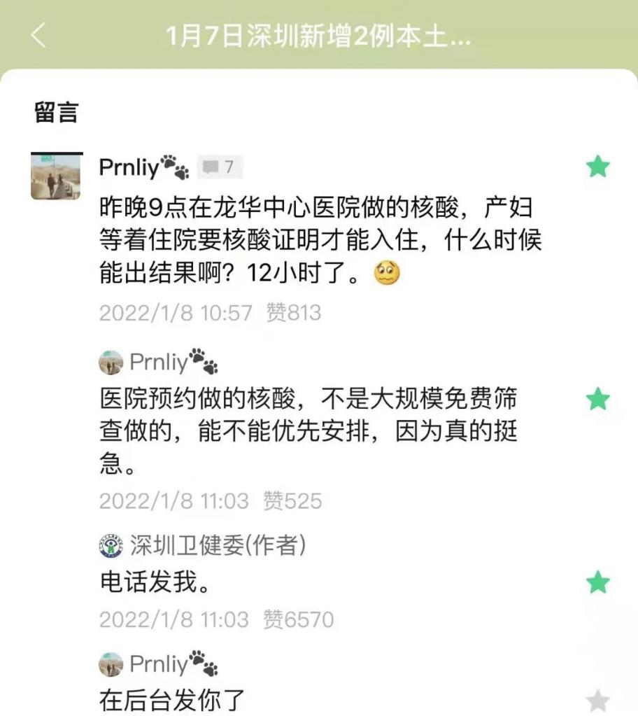 8日上午10時(shí)57分,在“深圳衛(wèi)健委”的微信公眾號(hào)推文下,一位叫“Prnliy”的網(wǎng)友留言,引起深圳市衛(wèi)健委工作人員的關(guān)注。這位網(wǎng)友說:“昨晚9點(diǎn)在龍華中心醫(yī)院做的核酸,產(chǎn)婦等著住院要核酸證明才能入住,什么時(shí)候能出結(jié)果啊?12個(gè)小時(shí)了。”