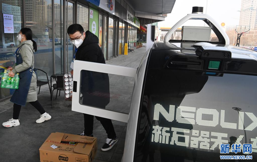 1月9日,無人配送車到達目的地,便利店主人在接收貨品。新華社記者 陶明 攝