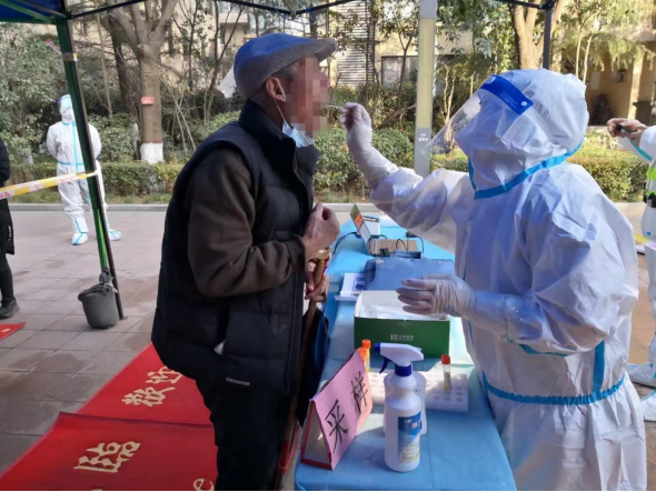 經(jīng)過星夜兼程,連夜入住酒店,開展各種培訓(xùn)、考核,為釆樣工作積極準(zhǔn)備著。12月19日,寶雞采樣隊(duì)接到的任務(wù)是支援浐灞金融園區(qū)全員的核酸釆樣工作。金融園區(qū)有將近9萬人 ,由于人口眾多,核酸釆集工作量大,時(shí)間要求緊迫,為了在規(guī)定時(shí)間內(nèi)完成釆樣任務(wù),寶雞采樣隊(duì)的隊(duì)員早出晚歸,每天休息時(shí)間很短暫,實(shí)在太累,常常在吃飯時(shí)打個(gè)盹。冬日的西安,寒風(fēng)凜冽,殘雪未消,嚴(yán)峻的疫情形勢,絲毫沒有嚇倒可愛的隊(duì)員們,反而更加喚起大家的熱血斗志。西安的夜晚很冷,零下6-7℃更是常態(tài),隊(duì)員們從不怕冷,更不叫苦,依然堅(jiān)守在凌冽的寒風(fēng)中,在崗位上一干就是數(shù)個(gè)小時(shí),任務(wù)集中的時(shí)候,大家顧不上吃飯 ,穿著厚重的防護(hù)服 ,全副武裝 ,連呼吸都很困難。數(shù)個(gè)小時(shí)的連續(xù)做戰(zhàn),每個(gè)人都腰酸背痛,防護(hù)面屏上更是結(jié)起了一層薄冰 ,隊(duì)員們的手指被凍得腫脹通紅,冰冷的消毒水一遍遍刺激著隊(duì)員們的末梢神經(jīng),但這絲毫沒有影響他們工作的熱情 ,沒有一個(gè)人退縮,太冷了他們就在原地跺跺腳,大家相互加油打氣,只為凌晨的堅(jiān)守和不忘初心的使命!隊(duì)員們耐心地囑咐大家張開嘴巴,發(fā)出“啊”的聲音 ,一個(gè),兩個(gè),三個(gè)……這樣的動(dòng)作,重復(fù)了一遍又一遍。碰到年齡較小的幼童,核酸采樣人員更是顧不得地面冰涼,單膝跪地完成采樣。