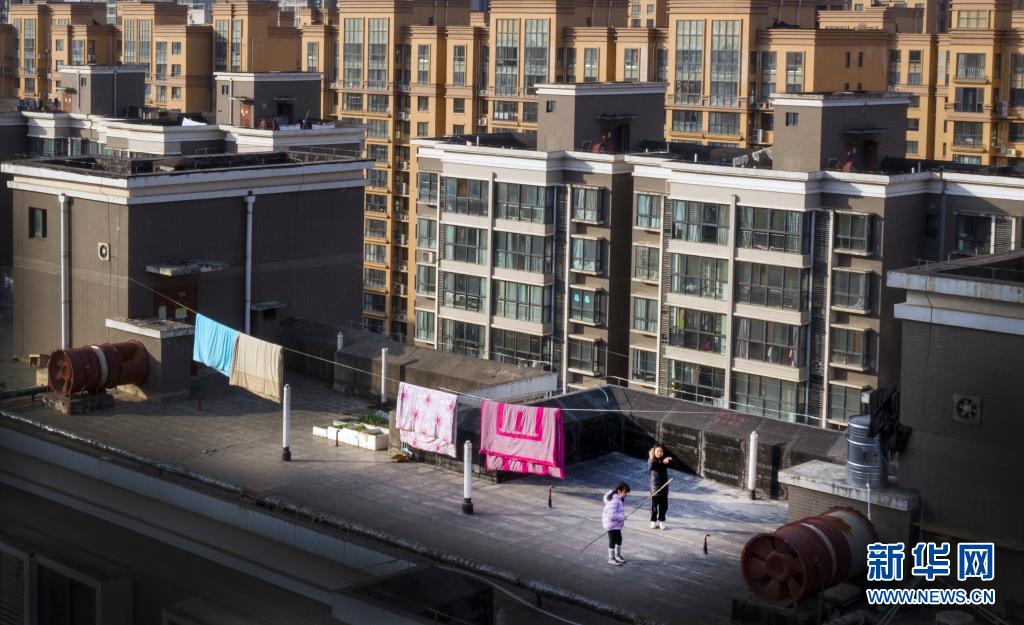 1月14日,西安市一小區(qū)居民在樓頂上跳繩鍛煉(無人機照片)。新華社記者 陶明 攝