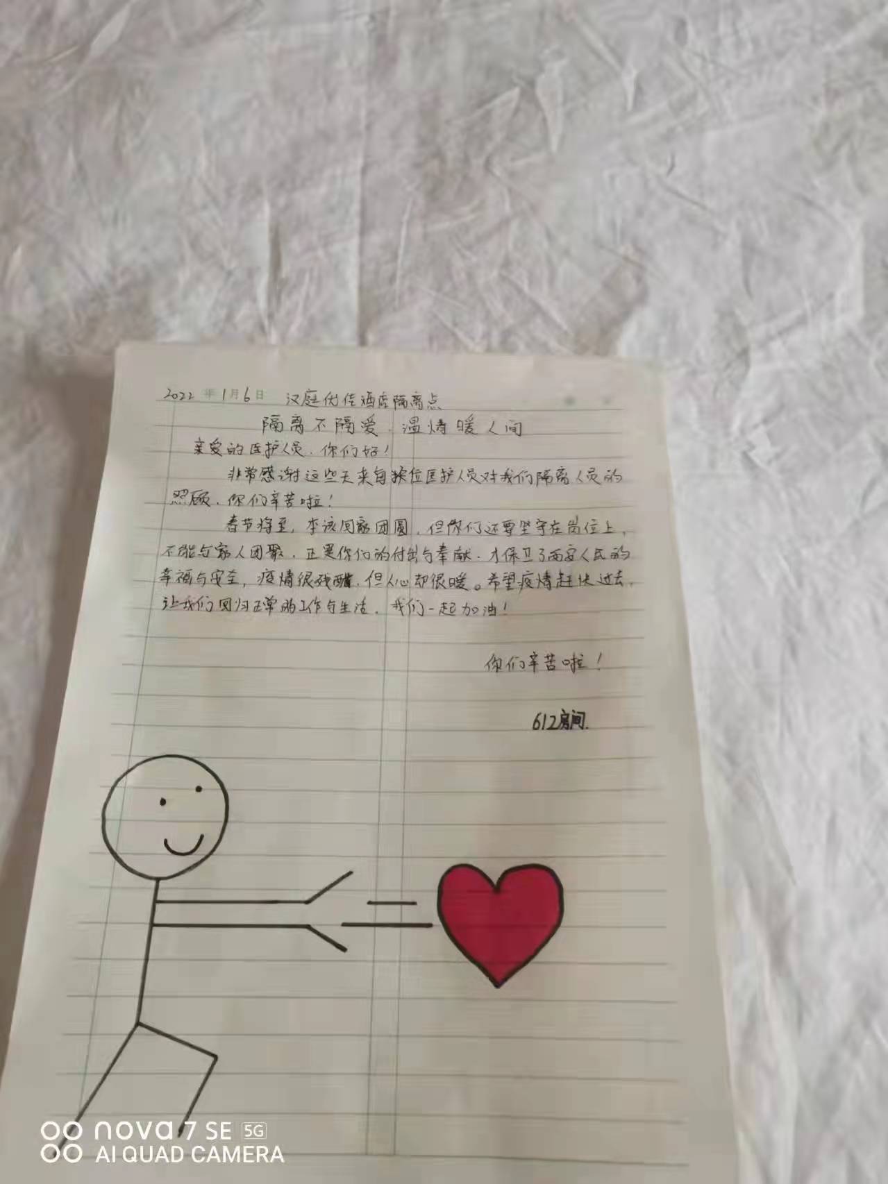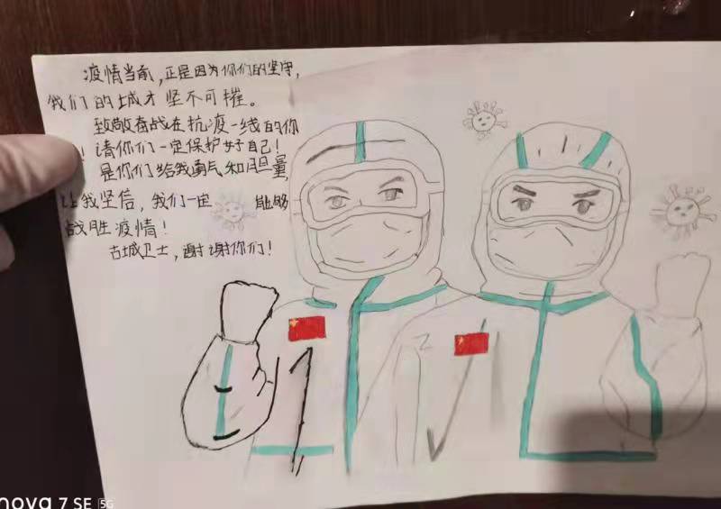 一幅幅手抄報(bào),一封封感謝信,一條條群留言,都在記錄著一個(gè)個(gè)勇毅且溫情的抗疫瞬間。“今天是我被隔離的最后一天,收拾好書(shū)包和小行李箱,準(zhǔn)備回家了,看著剩余的水果、零食,此刻心里不止是歡喜和激動(dòng),還有一絲不舍……”一名小學(xué)生在感謝信中寫(xiě)到:“接到老師的通知,我們要集體隔離,內(nèi)心還有點(diǎn)害怕,不知該怎么辦,來(lái)到酒店后,看到張張和藹可親的臉,我的心放下了,你們?yōu)槲覀儾珊怂?、送飯菜,讓我感到溫暖,感謝強(qiáng)大的祖國(guó),我們一定好好學(xué)習(xí),長(zhǎng)大做一個(gè)對(duì)社會(huì)有用的人”。據(jù)介紹,隔離期間,有四名12歲的學(xué)生是獨(dú)自隔離,沒(méi)有家人的陪護(hù),在工作人員每天的問(wèn)候中,他們懂事有禮貌,只要求工作人員幫他們打印作業(yè),每天在房間堅(jiān)持看書(shū)學(xué)習(xí)。