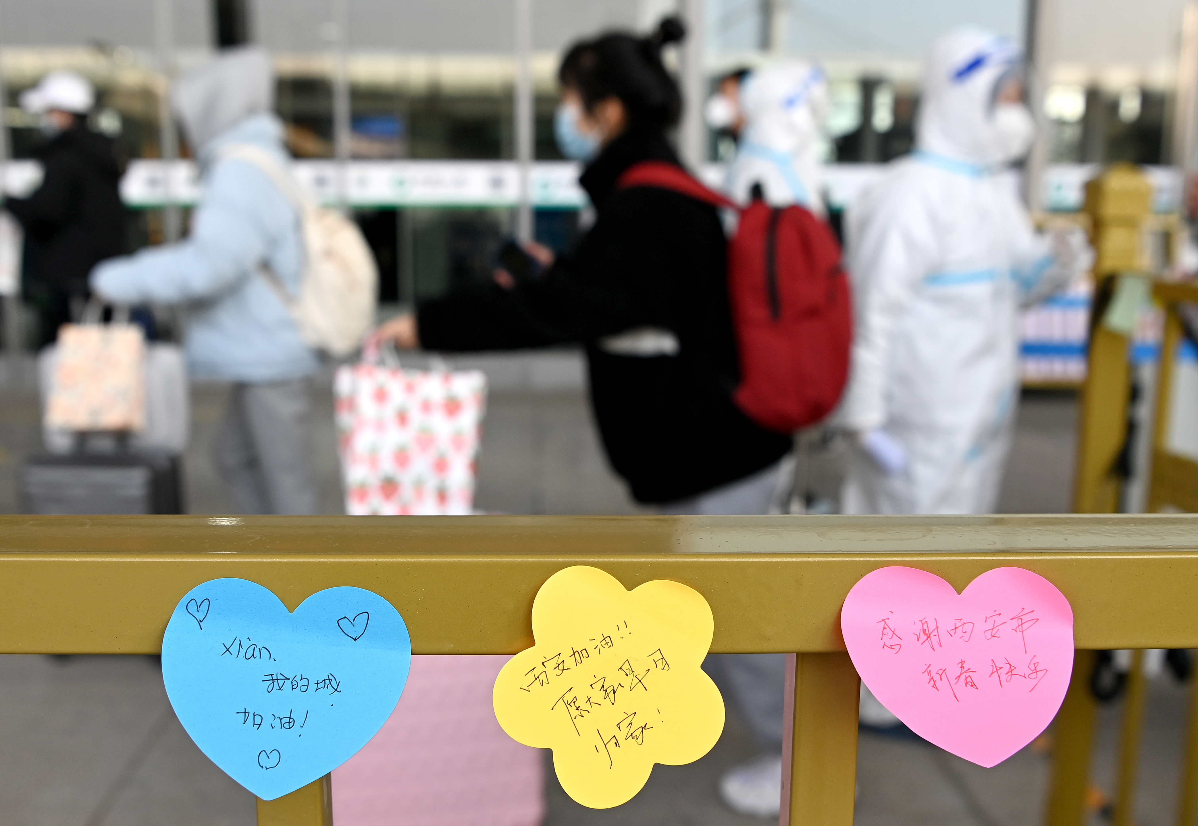 1月16日,西安北客站,進(jìn)站口的欄桿上留下了離校返鄉(xiāng)西安高校學(xué)生的暖心留言。 新華社記者 劉瀟 攝