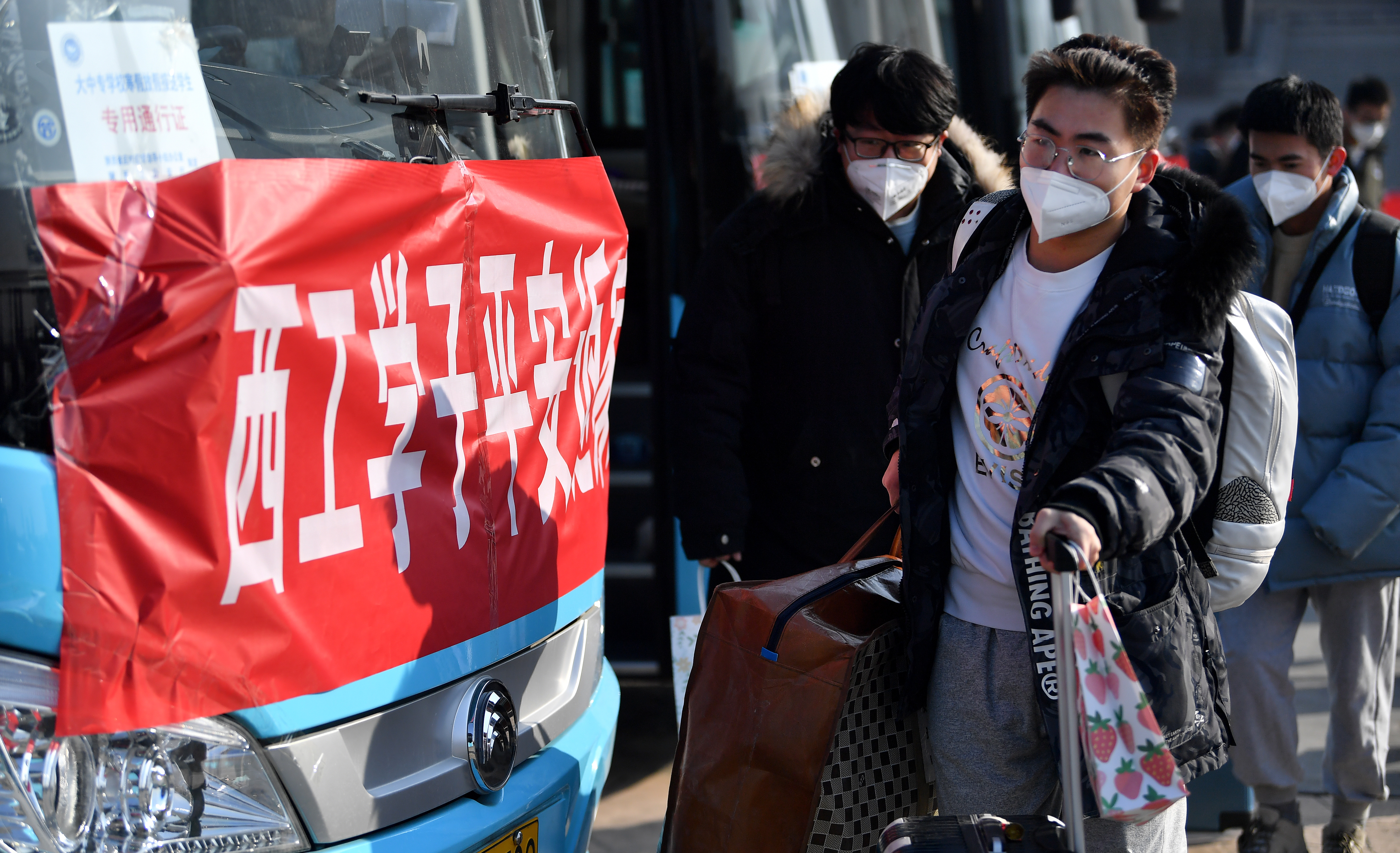 1月16日,西安工業(yè)大學(xué)未央校區(qū)的學(xué)生準(zhǔn)備乘坐統(tǒng)一安排的大巴前往車站。新華社記者 劉瀟 攝