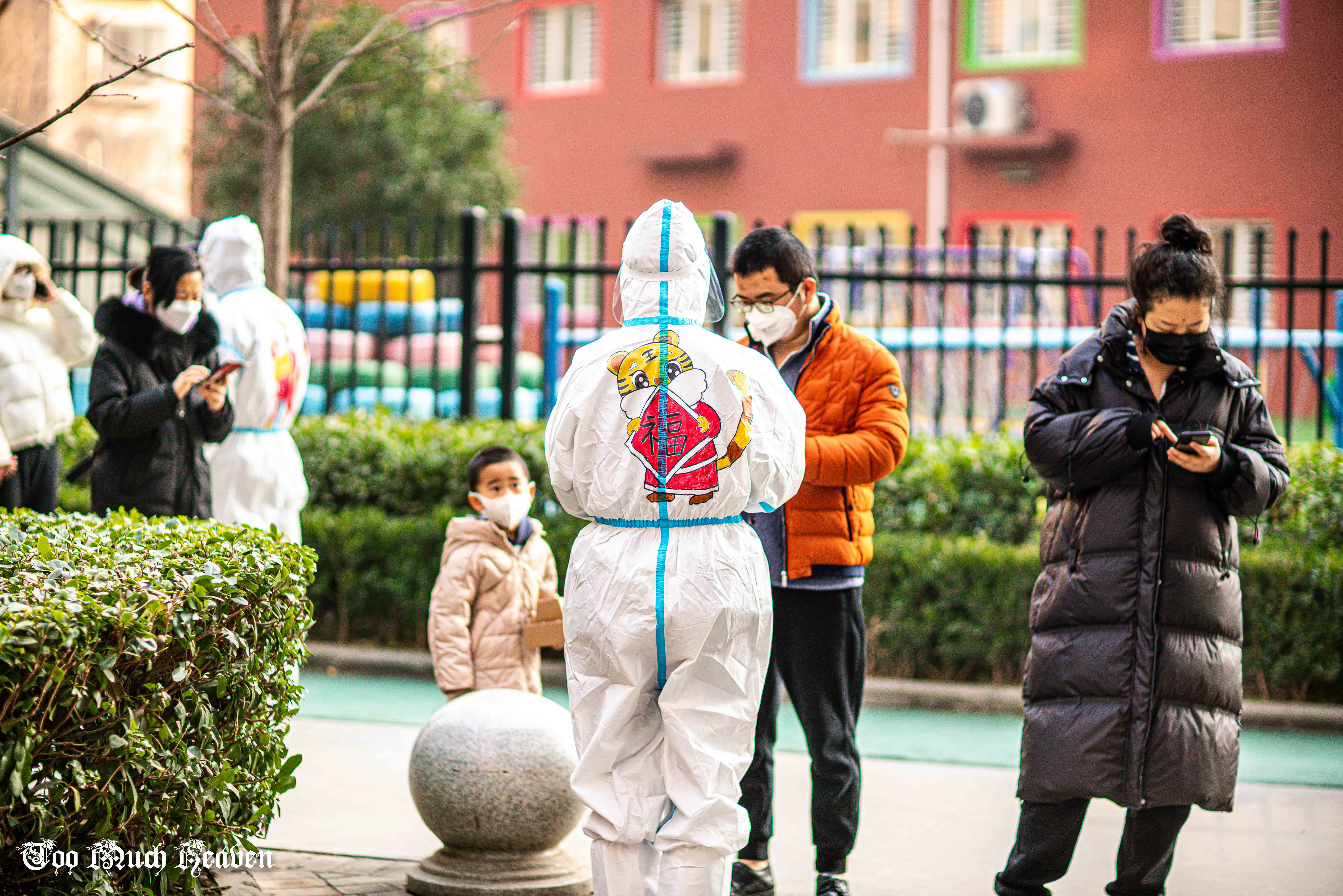 這個(gè)小區(qū)有13位志愿者組成了“抗疫志愿者先鋒隊(duì)”,全程協(xié)助醫(yī)護(hù)人員做好核酸篩查工作。隊(duì)長(zhǎng)黨王杰每天要在防護(hù)服上為大家編號(hào)、寫名字,以示區(qū)分。有一天,他寫著寫著突然來(lái)了主意,“在防護(hù)服上畫點(diǎn)不一樣的圖案行不行?疫情向好,新春臨近,來(lái)個(gè)虎年主題?”