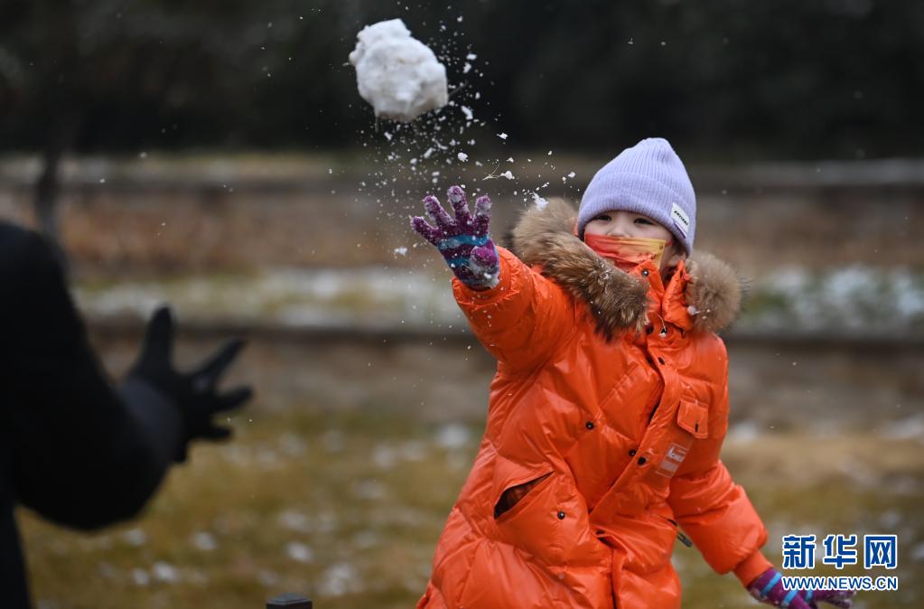 1月23日,小朋友在街頭與家人打雪仗。