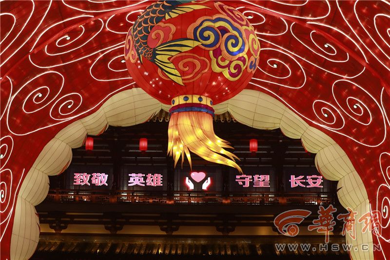 在雁南一路口設(shè)置了“致敬英雄 守望長安”燈組。宋立嬌介紹,設(shè)計這組燈是為了向抗疫英雄致敬,并鼓舞全市人民抗疫士氣。雁南一路以南水池上“百鳥朝鳳”燈組,以鳳凰、牡丹、百鳥為主題,打造百鳥朝鳳氛圍裝置,體現(xiàn)出一切生機(jī)勃勃,美好時光來臨,看到了一片美好的前景。