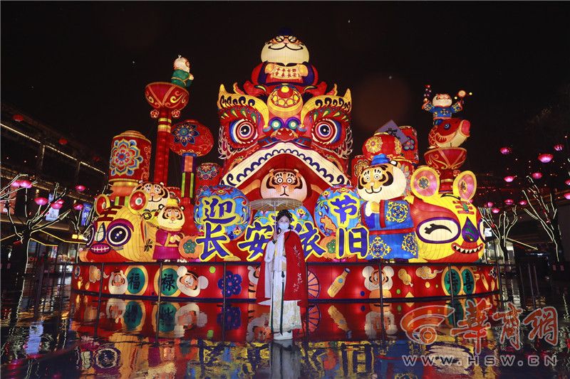 “虎虎生威”燈組坐落于街區(qū)地屏廣場處,底座直徑20米,高約15米,是大唐不夜城街區(qū)占地面積最大的一個燈組。燈組以生肖“虎”的Q版造型為主要形象,融入非遺布老虎和傳統(tǒng)虎頭帽等年節(jié)元素,展現(xiàn)了喜慶鬧春的生動景象。這組燈寓意喜慶納福、如意吉祥,將春節(jié)的福瑞和吉祥傳達(dá)給西安乃至全國人民。