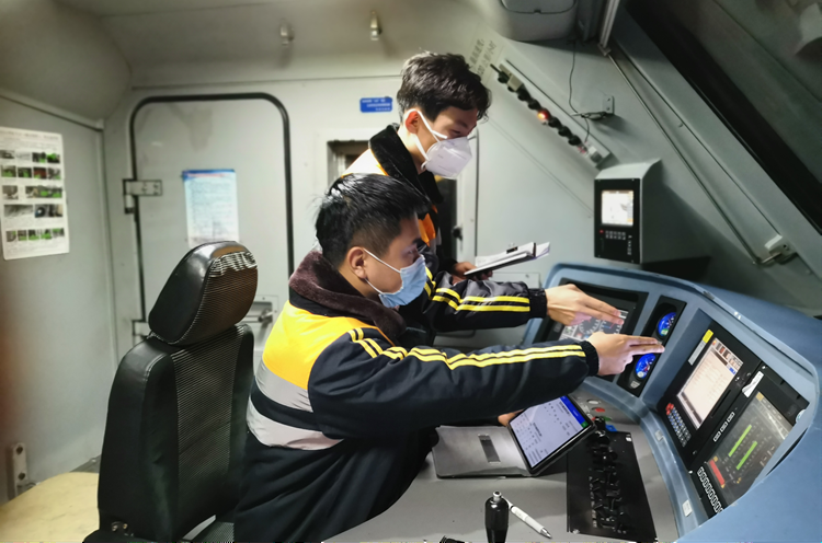 劉柯和師傅確認(rèn)列車(chē)運(yùn)行參數(shù)。