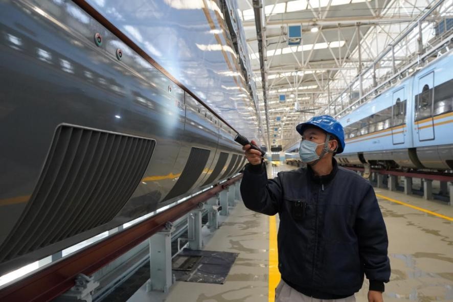1月29日,在中國(guó)鐵路西安局集團(tuán)公司西安動(dòng)車段檢修庫內(nèi),質(zhì)檢車間質(zhì)檢三組質(zhì)檢員龔奇正檢查著動(dòng)車組走行部位,手中的可錄式手電一一掃過車輪、齒輪箱、閘片等配件,眼隨手動(dòng),緊盯著手電光照的地方,時(shí)不時(shí)伸手確認(rèn)配件安裝狀態(tài)。
