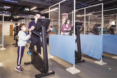 建設(shè)者代表及家屬在冬奧村體驗(yàn)健身設(shè)施。