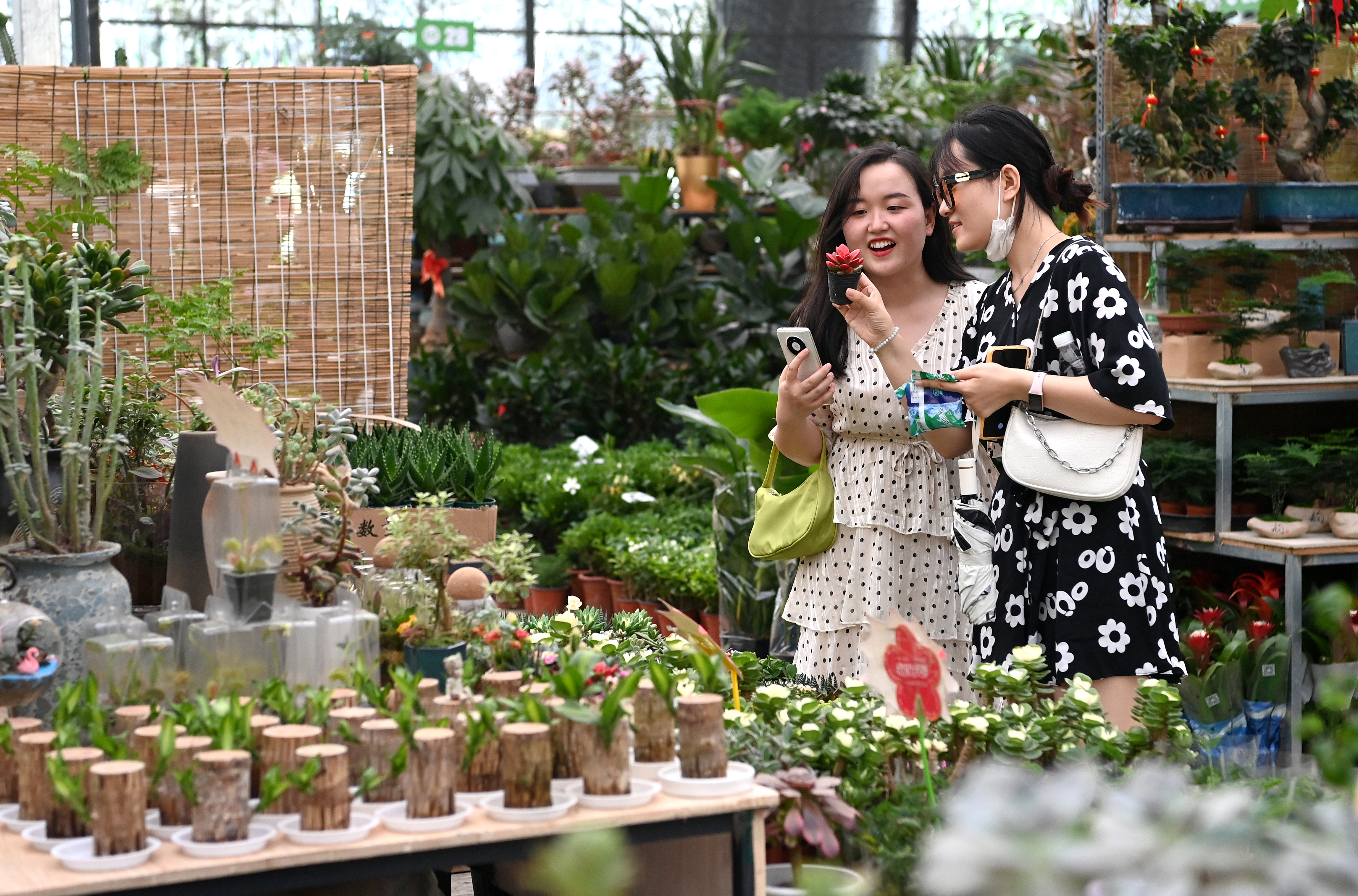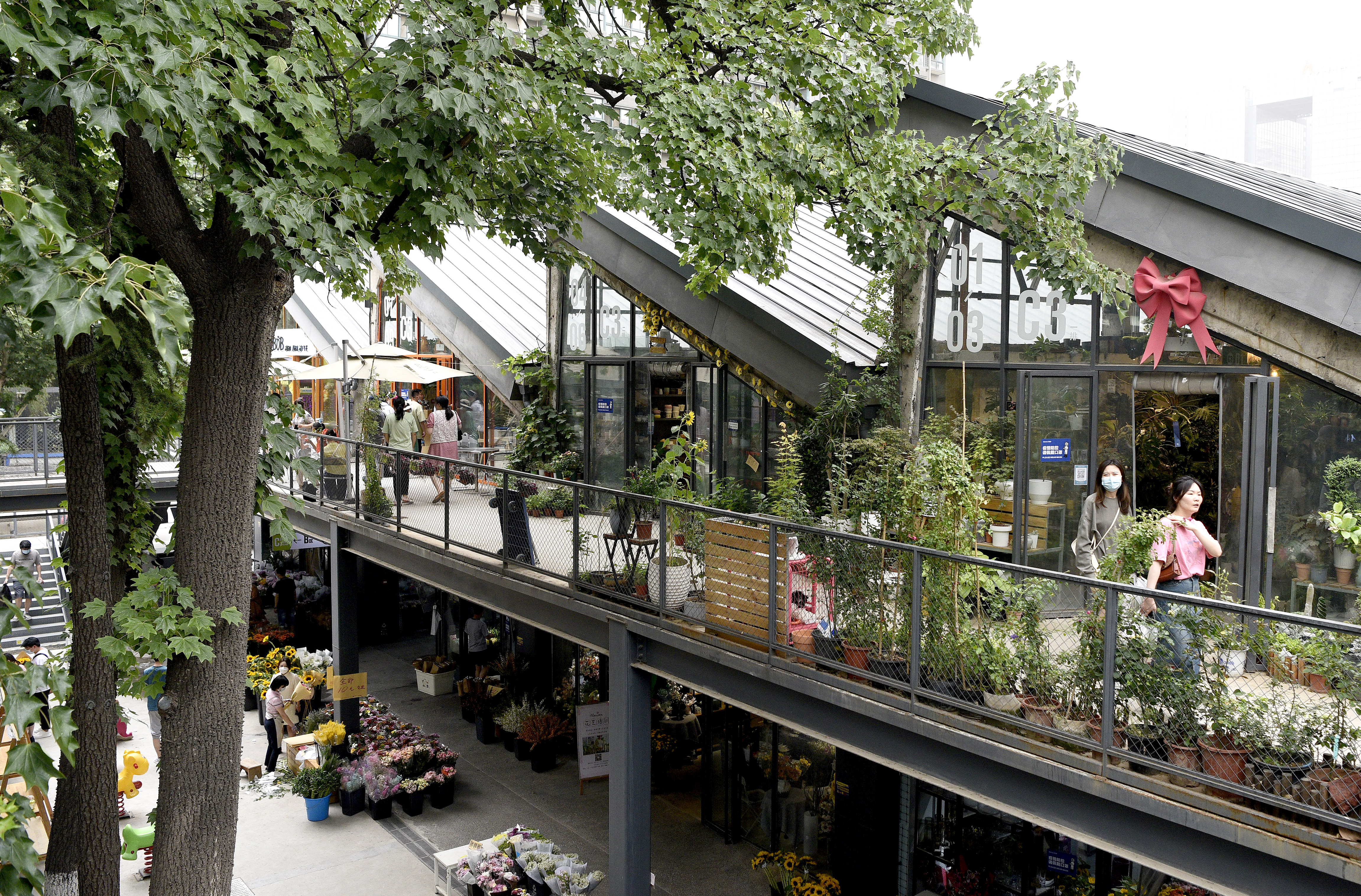 5月29日,市民在西安際華3511文創(chuàng)科技園內的花市休閑。 新華社記者 劉瀟 攝