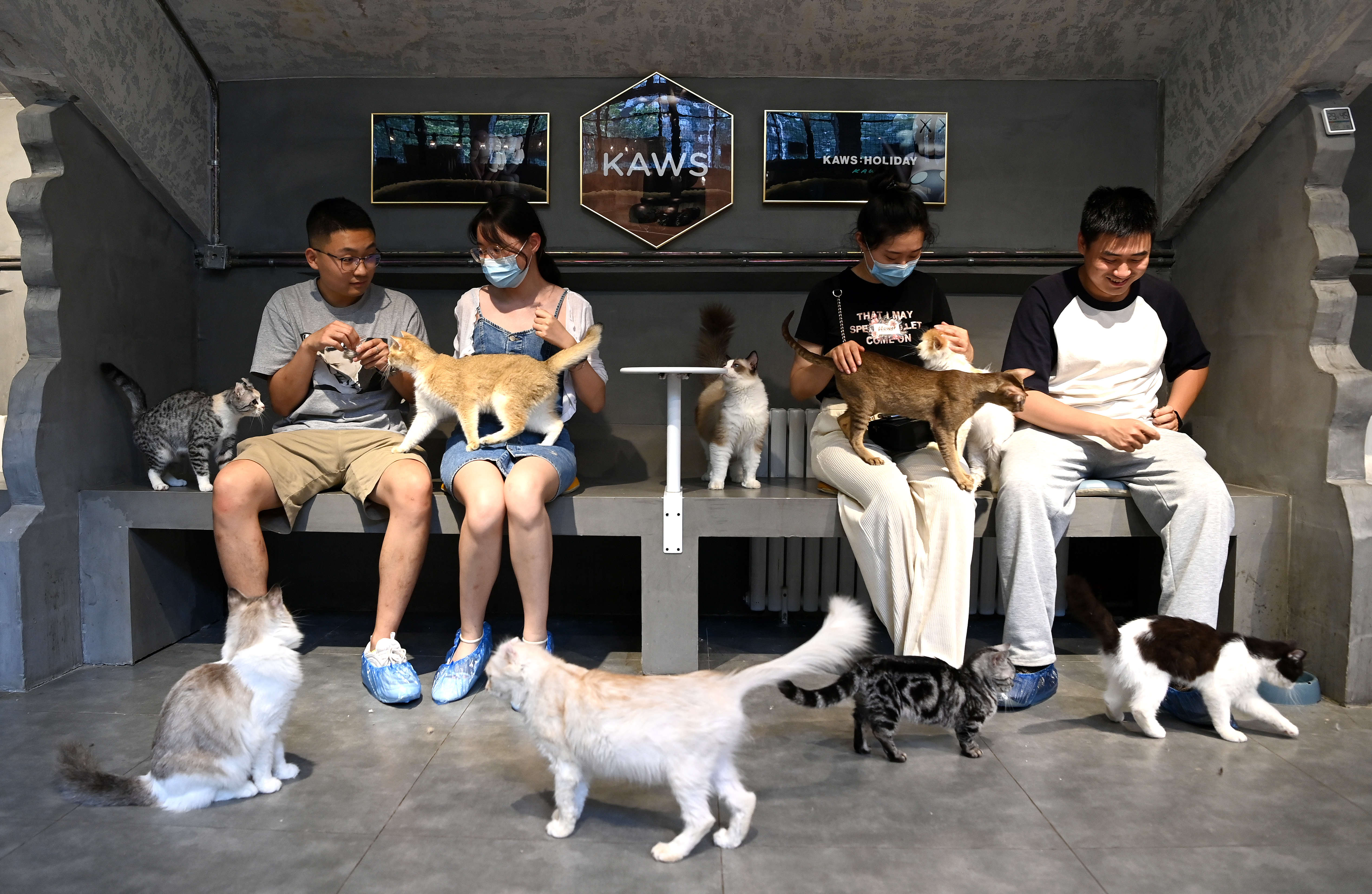 市民在西安際華3511文創(chuàng)科技園內的貓咖逗貓(5月20日攝)。 新華社記者 劉瀟 攝