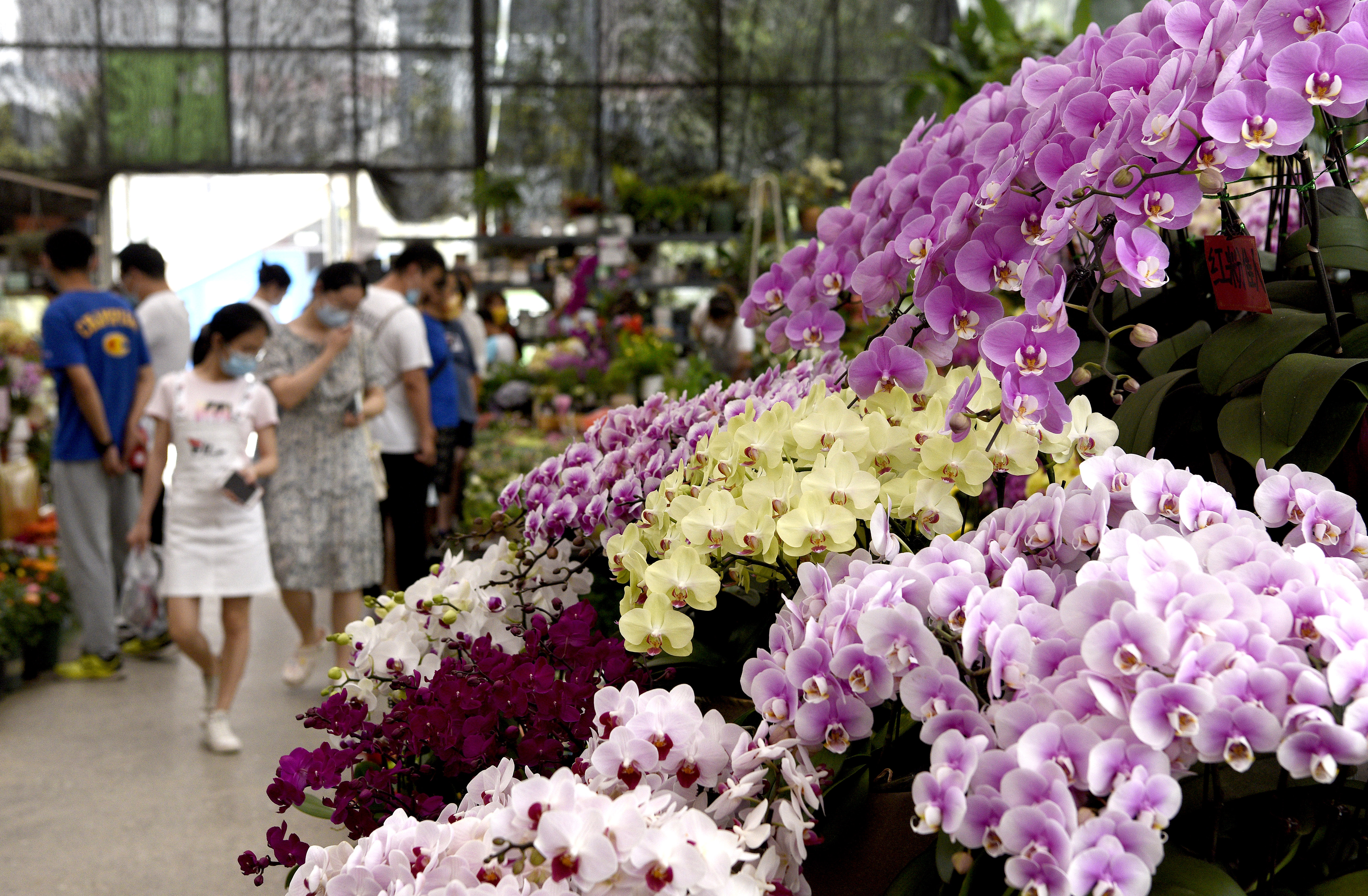 市民在西安際華3511文創(chuàng)科技園內的花市挑選花卉(5月20日攝)。 新華社記者 劉瀟 攝