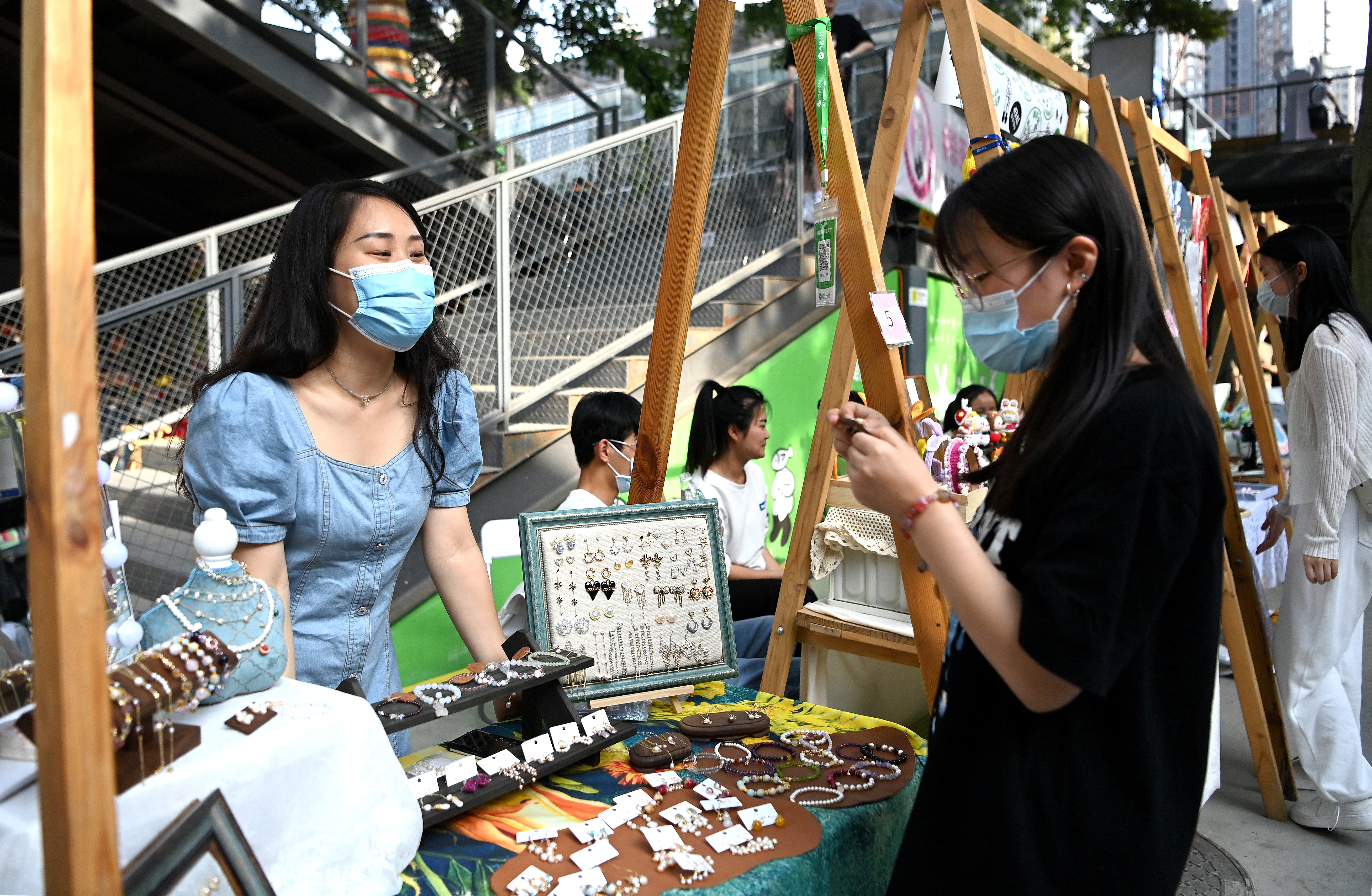 市民在西安際華3511文創(chuàng)科技園內的市集上挑選飾品(5月20日攝)。 新華社記者 劉瀟 攝