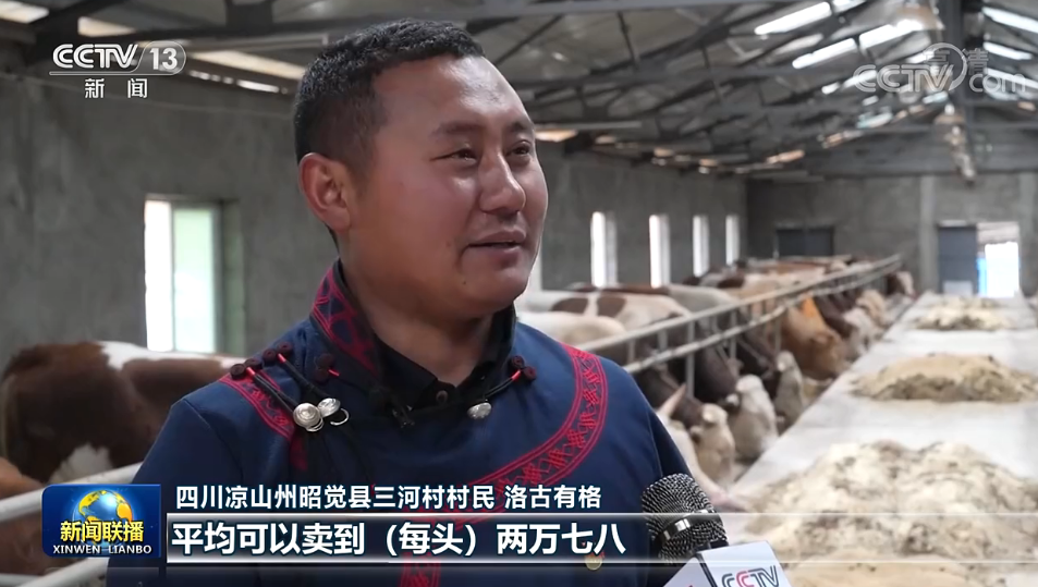 四川涼山州昭覺縣三河村村民 洛古有格:當時總書記來的時候,我們這個養(yǎng)牛只有十幾頭。通過發(fā)展,我們三河村有了1000多頭這個西門塔爾牛?,F在我們這個牛,平均可以賣到(每頭)兩萬七八,大的可以賣到三萬多元,效益特別好。