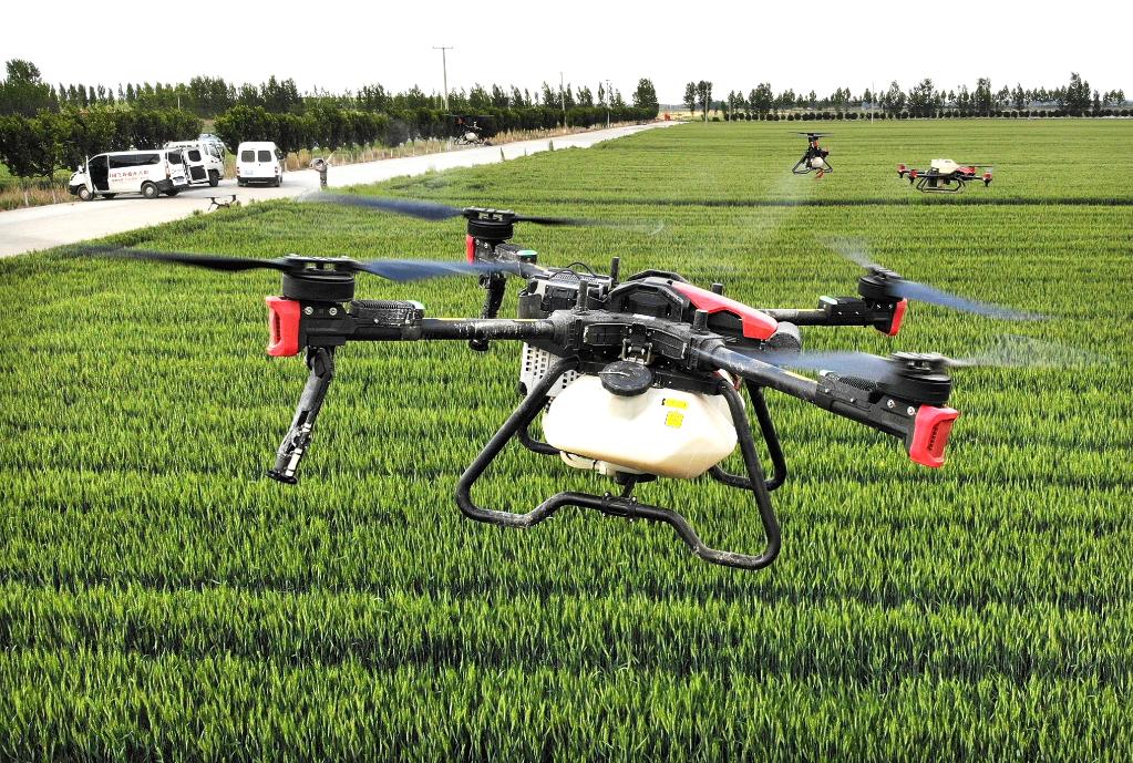 5月17日,在青島市平度田莊鎮(zhèn)幸福莊村,植保無(wú)人機(jī)在進(jìn)行“一噴三防”田間作業(yè)。新華社記者李紫恒 攝