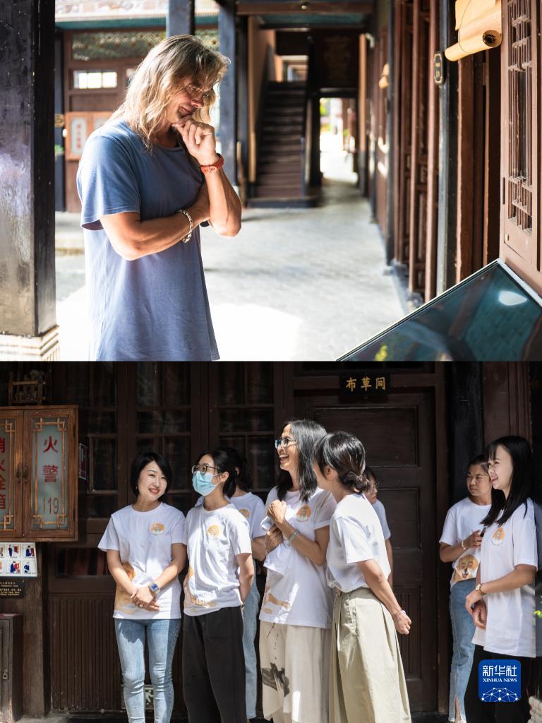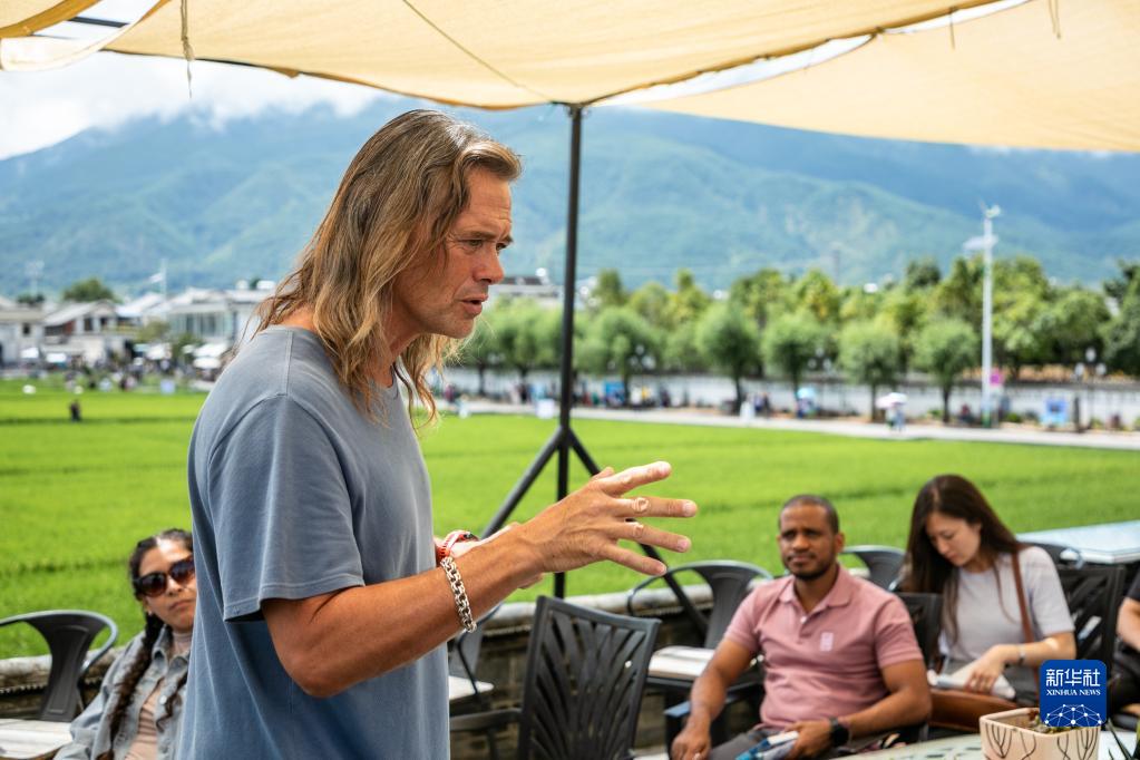 8月27日,林登在喜洲古鎮(zhèn)喜林苑向外國(guó)訪客介紹當(dāng)?shù)匚幕?。新華社記者 曹夢(mèng)瑤 攝