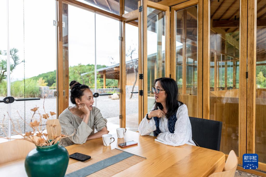 8月31日,林登的妻子瑾妮(右)向當(dāng)?shù)匚璧讣叶^蘭學(xué)習(xí)白族話。新華社記者 曹夢(mèng)瑤 攝