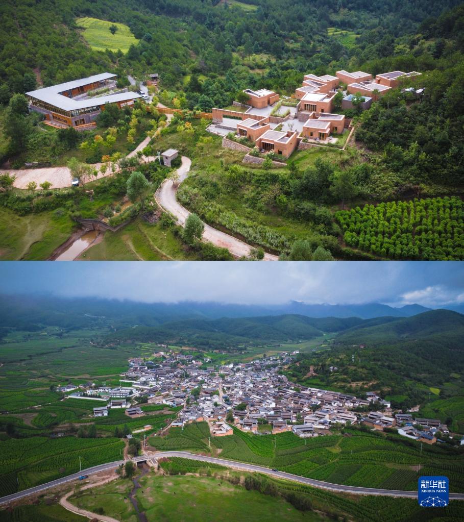 拼版照片:上圖為位于云南省沙溪鎮(zhèn)石龍村的喜林苑沙溪店(8月31日攝,無(wú)人機(jī)照片);下圖為喜林苑沙溪店所在的石龍村(8月31日攝,無(wú)人機(jī)照片)。新華社記者 曹夢(mèng)瑤 攝