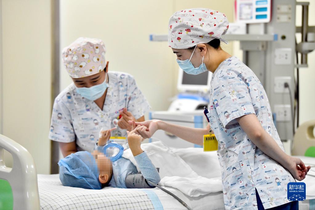 在山東省棗莊市婦幼保健院兒童ICU病房,醫(yī)護人員為完成靶向治療藥物諾西那生鈉的4歲脊髓性肌萎縮癥患兒加油鼓勁(2022年1月1日攝)。諾西那生鈉注射液是我國首個獲批治療脊髓性肌萎縮癥的進口藥物,2019年進入中國市場時,每針價格近70萬元。在2021年國家醫(yī)保目錄藥品談判中,以3.3萬元每針的價格進入新版醫(yī)保藥品目錄。新華社記者 郭緒雷 攝