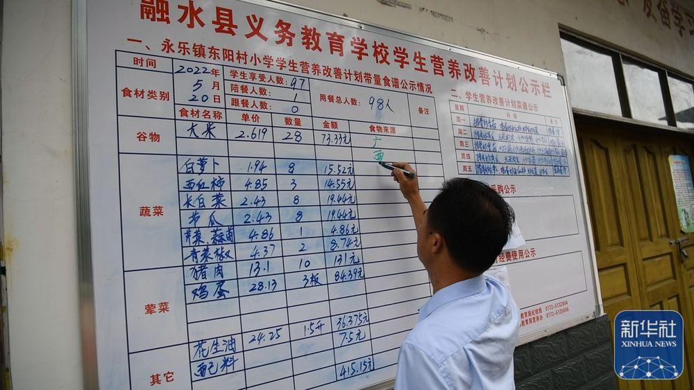 5月20日,在廣西融水苗族自治縣東陽村小學(xué)食堂,校長藍正立在告示牌上寫菜譜。新華社記者 張愛林 攝